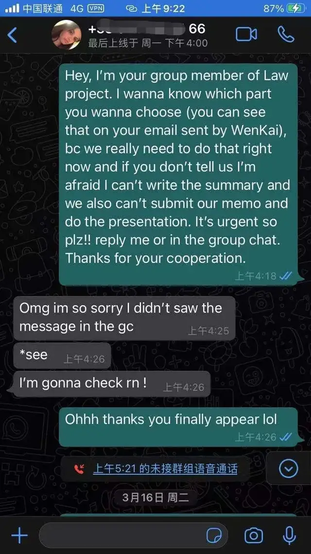 我和另一个组员在群里不停地呼唤她,但是毫无回应。我们也很贴心地没有再去打搅她的美梦(毕竟那个时候韩国是凌晨)