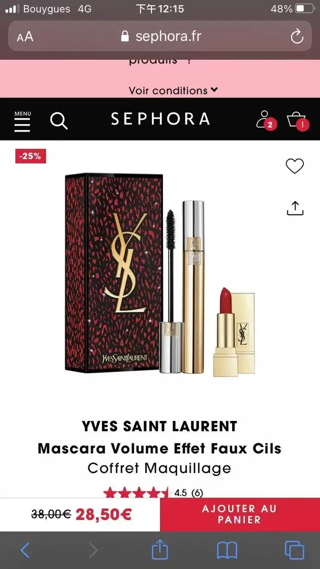 我还买了一些套装,打完折也就是三四十欧,里面最少有两样东西,下面这个ysl套装里面是睫毛膏和口红,才不到30欧