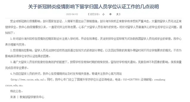 教育部留学服务中心已作出说明。因受疫情防控影响无法按时返校而选择网课导致境外停留时间不符合学制要求的情况,不作为影响学生获得学位学历认证结果的因素。
