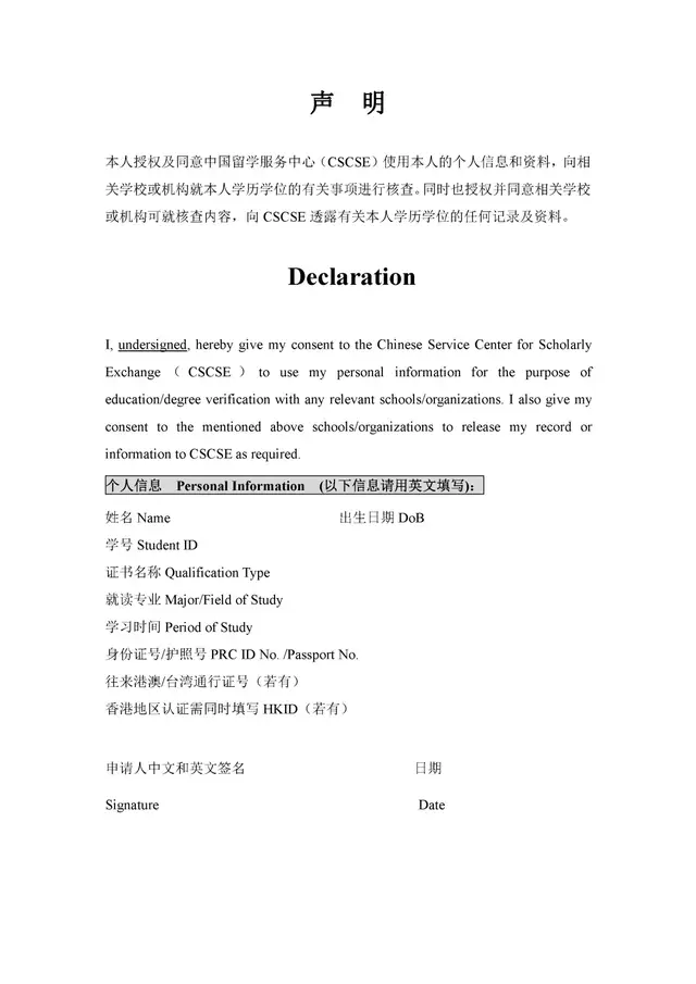 4. 按留服中心要求填写并签署的文凭证书核查授权声明。该声明可官网下载: