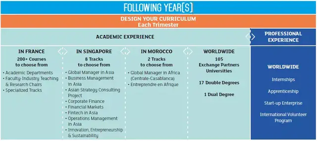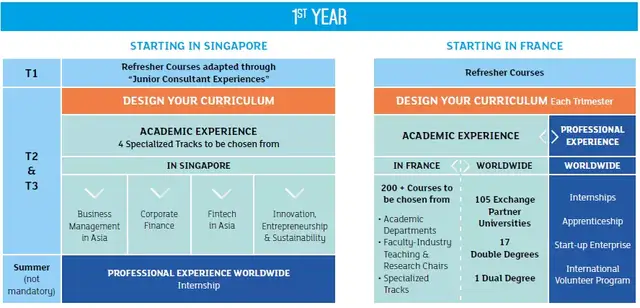 学生可选择ESSEC位于法国或新加坡的国际校区开始项目。根据您的选择,第一年的课程会发生变化。