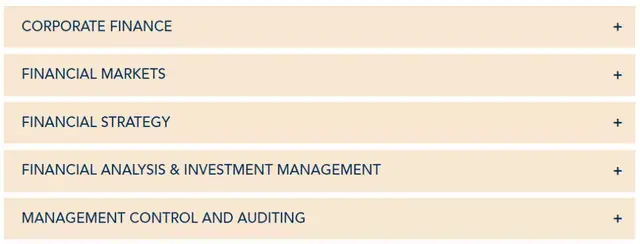 本阶段课程是为学生在感兴趣的领域里成为专家做准备,每个专业都由Audencia教授进行一学期授课,学生在第二、三学期需从以下18个专业方向中选择两个专业方向学习。