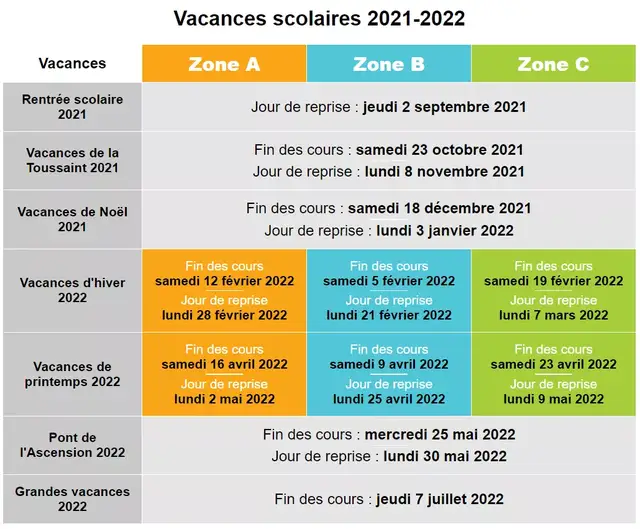 除了科西嘉岛,所有学区的返校日期都是9月2日星期四。万圣节假期( Toussaint)是10月23日到11月8日;圣诞假期从12月18日到1月3日;耶稣升天假期(Ascension)是5月25日到5月30日;暑假是7月6日开始。