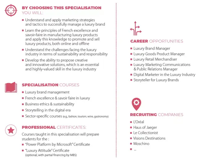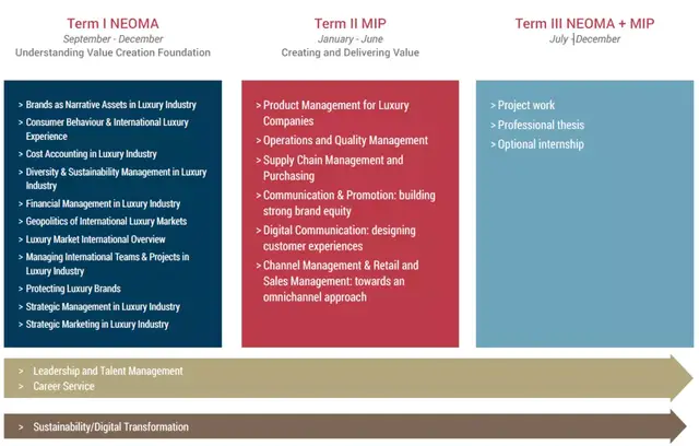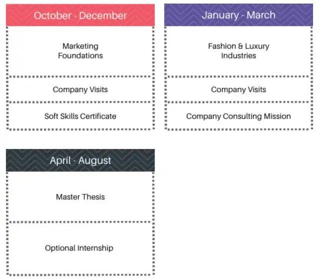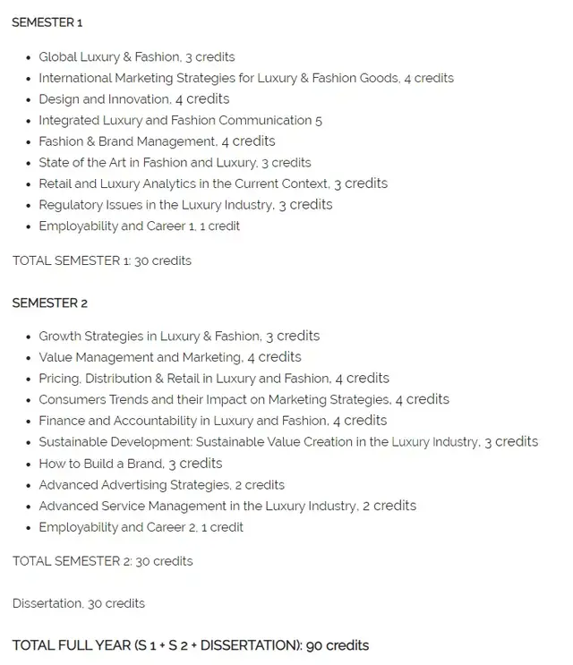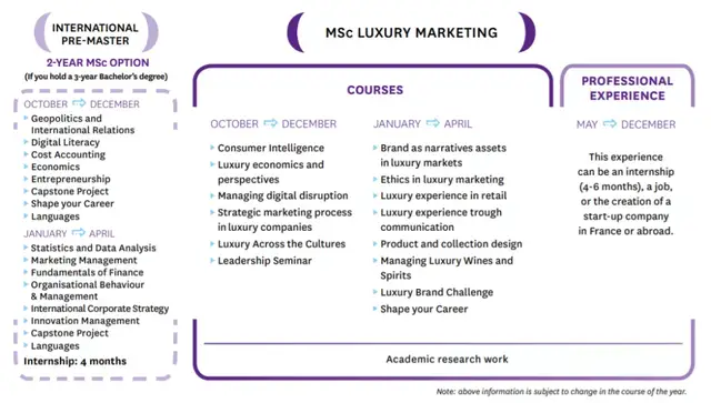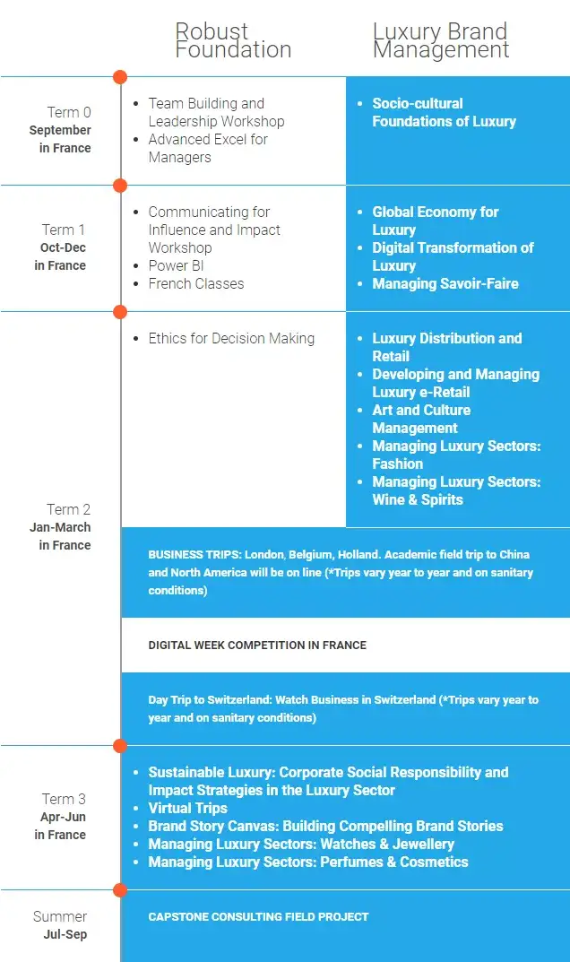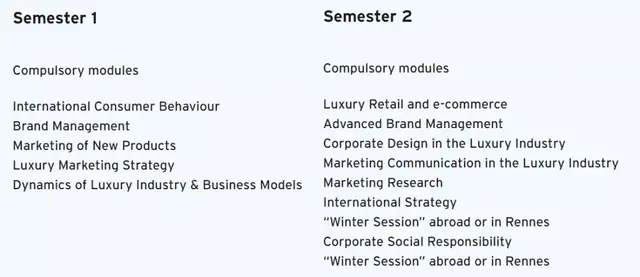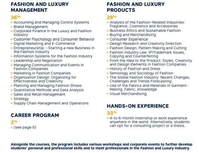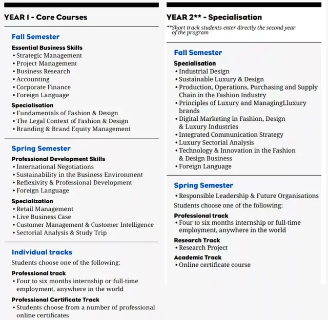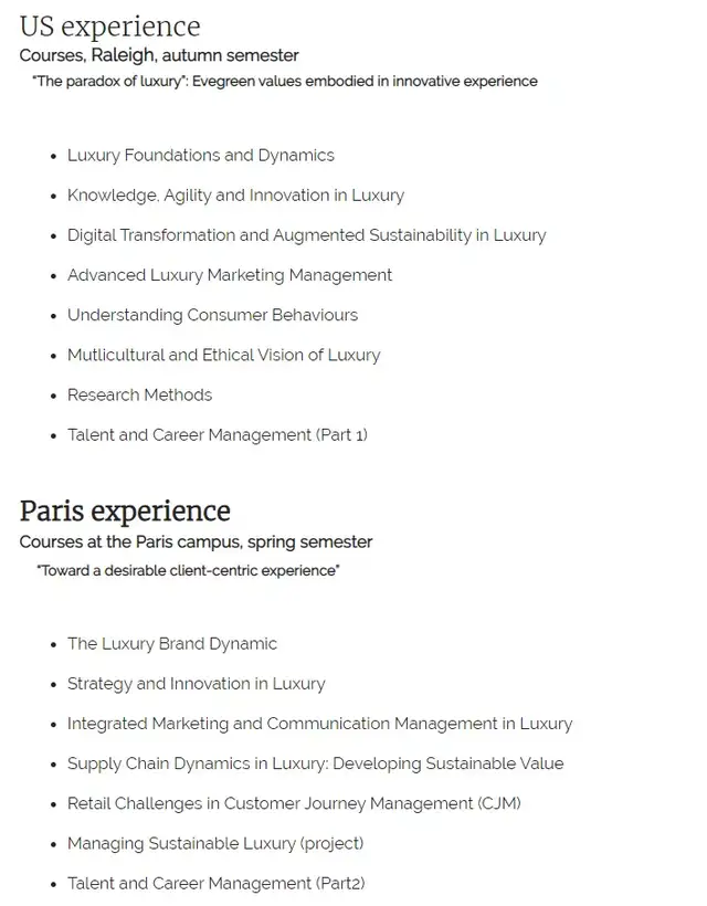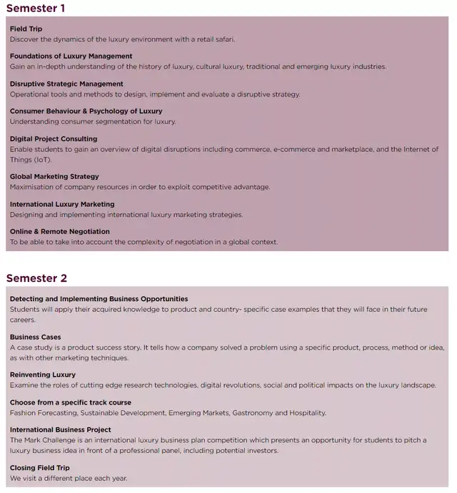 专业课程包含:Luxury brand management、French excellence & savoir faire in luxury、Business ethics & sustainability、 Storytelling in the digital era、Sector-specific courses (e.g., fashion, tourism, wine, gastronomy)