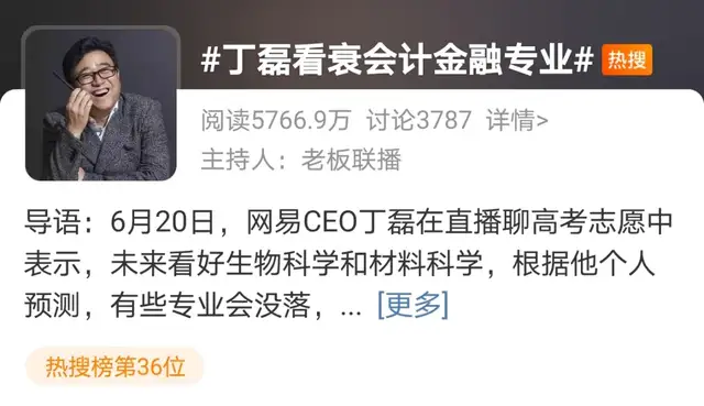 前两天,网易CEO丁磊在直播中聊起了高考志愿,随后#丁磊看衰会计金融专业#冲上热搜。