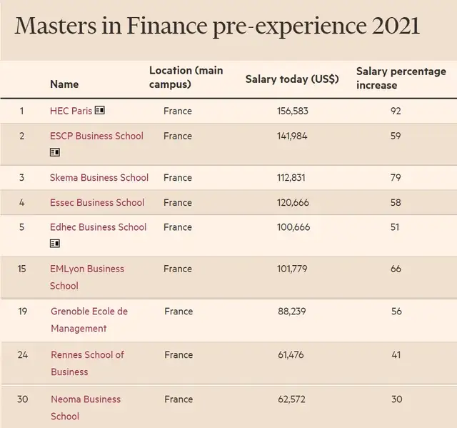 其中HEC Paris位列第1,ESCP第2,SKEMA第3,ESSEC第4,EDHEC第5。HEC更是十年来第9次登顶全球最佳金融学硕士项目。除此之外,法国另有Emlyon第15名、GEM第19名、RSB第24名、NEOMA第30名等四所高商进入榜单,占总数1/6。